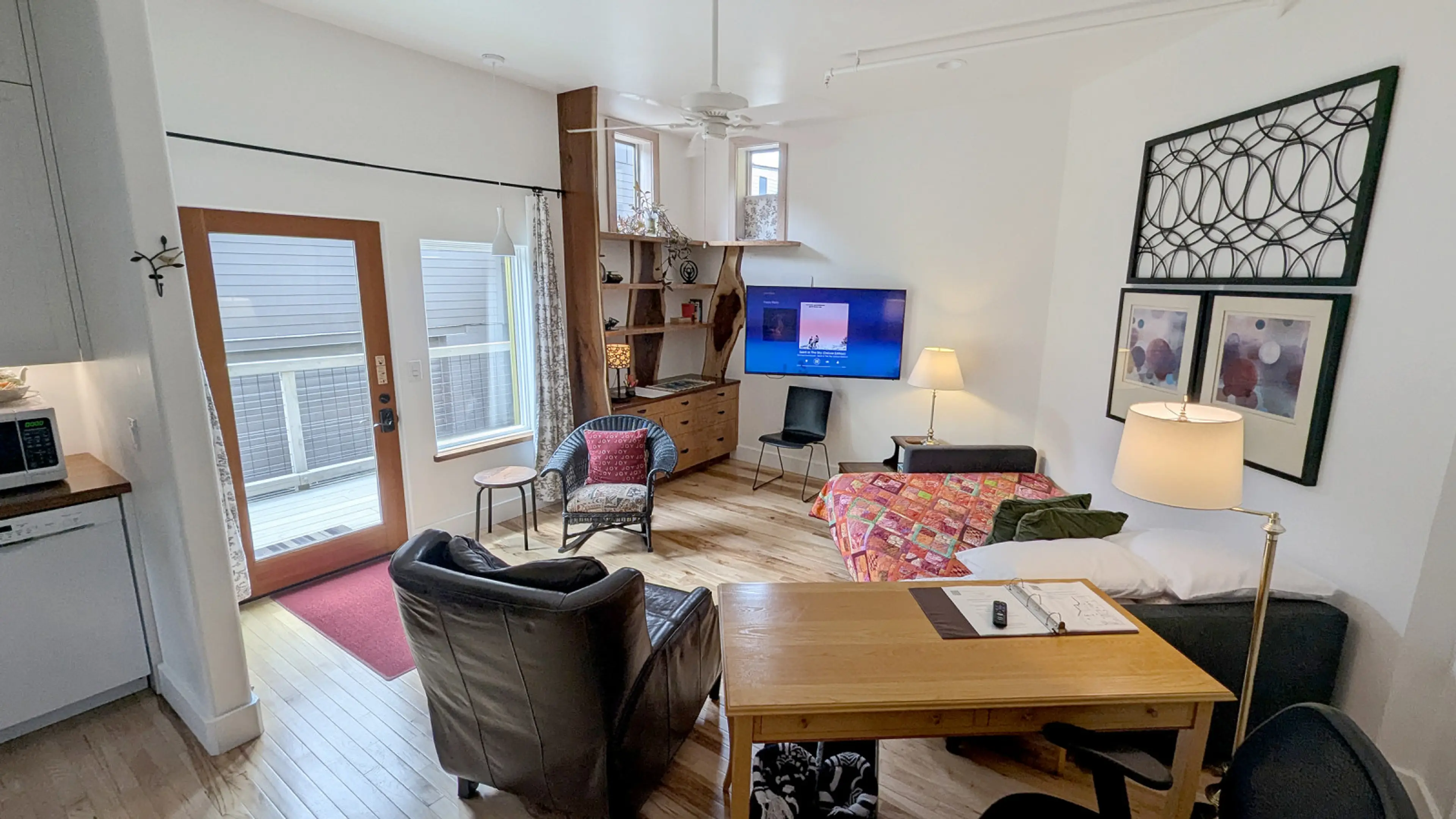 WestWood Shed • A Vacation & Work Stay: a unique and relaxed entertainment space. Our four Private Apartment Suites, each with a front living room and open kitchen for entertaining your visitors, offer a keyed separate bedroom and laundry, all within your private Suite. Suite #4 is "Visitable" (acce...